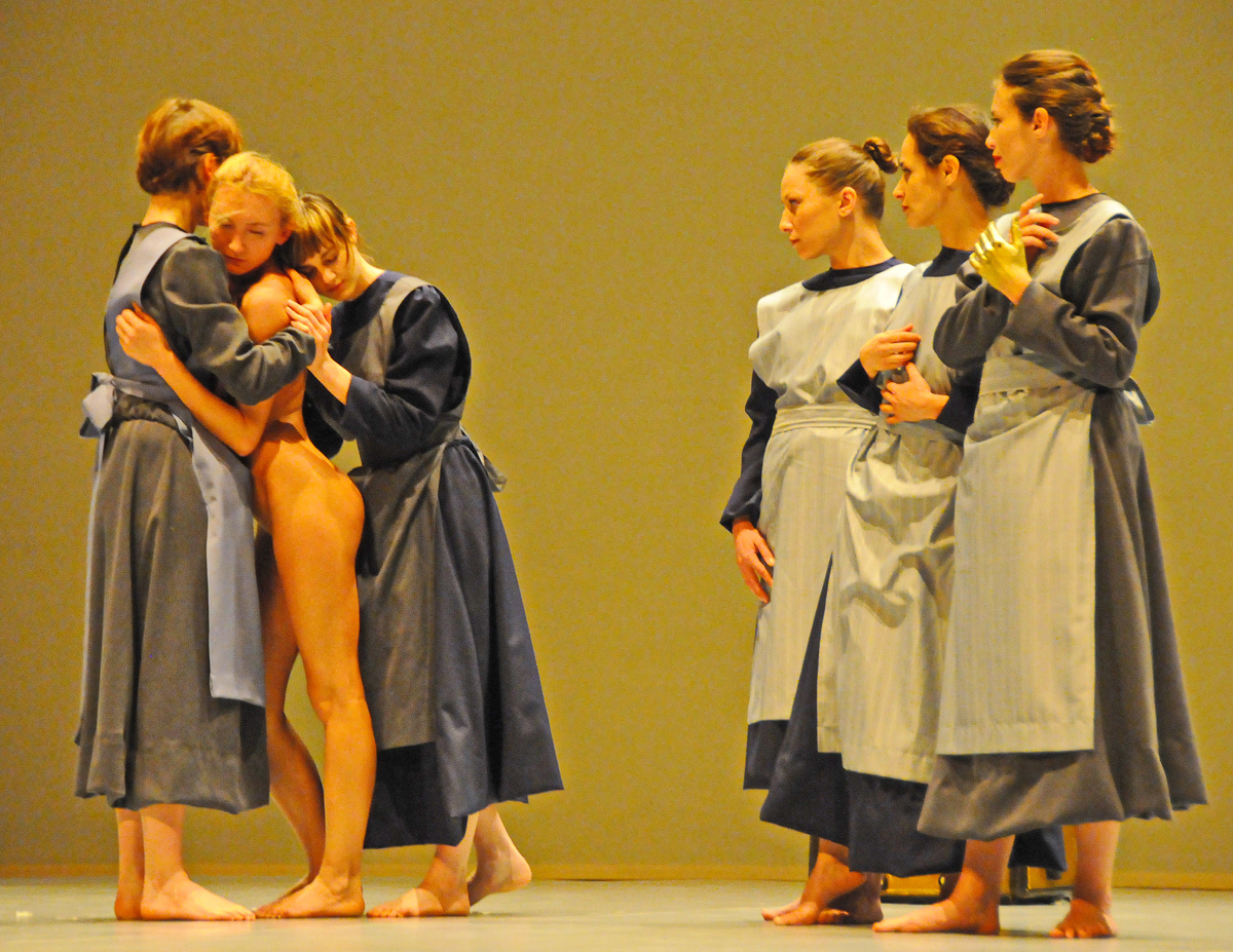 Есть, правда, шокирующий нюанс: перед тем как начать играть, девочки по очереди медленно «отрезают» ножницами собственные языки и бросают их на пол. Кровавого натурализма постановщик избежал, действие выглядит условным, а на пол актрисы кидают, очевидно, что-то очень вкусненькое, поскольку эти кусочки тут же съедает бегающий по сцене симпатичный упитанный лабрадор, приветливо повиливающий хвостиком.