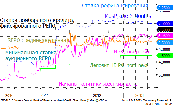Самый верный способ оценить «накачку», это взглянуть на ставки ЦБ РФ. Уровни коротких ставок межбанка как были, так и остаются на уровне 6%. ЦБ РФ как выдавал РЕПО на уровнях выше минимальной ставки в 5.5%, так и выдает. Некоторое снижение показал Моспрайм 3 мес., но это легко можно связать с ожиданиями предстоящего осенью (или, даже в августе) снижения ставок на один шаг после того как ЦБ РФ увидит что инфляция стала ниже верхней границы в 6%.