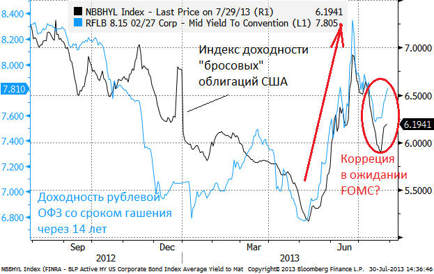 Сегодня ночью предстоит собрание ФРС, и в ожидание этого события наблюдается падение рынков облигаций. На графике выше мы сравниваем среднюю доходность индекса Блубмерга «Active HY US Corporate Bond» с доходностью одного из выпусков ОФЗ. Обратите внимание, что даже колебания осени-зимы 2012 года очень похожи. При этом ралли прошлой осени пытались объяснить либерализацией рынка и с предстоящим расчетом через Euroclear/Clearsteam. Также пытались объяснять инфляцией, ожиданиями ставок ЦБ РФ. Сейчас очевидно, что это не так — цены длинных ОФЗ крайне зависят от мировой конъюнктуры.