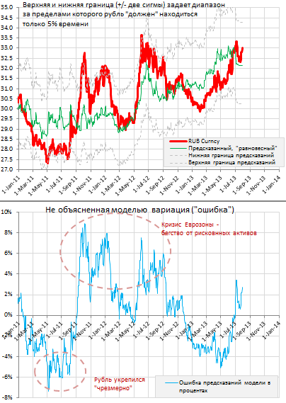 Наша модель продолжает предсказывать укрепление рубля, однако, к сожалению «фундаментальный анализ» не позволяет предсказывать траекторию, а отклонение цены от «равновесного» состояние может продолжаться долго (к примеру, полгода, как это было осенью 2011 и зимой 2012).