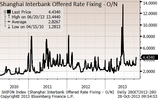 В пятницу продолжались волнения, связанные с некоторым ростом коротких межбанковских ставок в Китае. Напомним, что с 17 октября центробанк этой страны перестал выдававать 7-дневные РЕПО, что привело к некоторому повышению ставок «в коротком конце». На этом появились разговоры о возможном ужесточении монетарной политики. Также есть рассуждения, что может повториться летний мини-кризис ликвидности. Но в целом, мы не видим причин для опасений. Некоторое повышение ставки в Китае — это событие сомнительной важности («nonevent»). Мы видели сообщения, что повышение говорит об обратном — хороший экономический рост предполагает больший спрос на деньги.