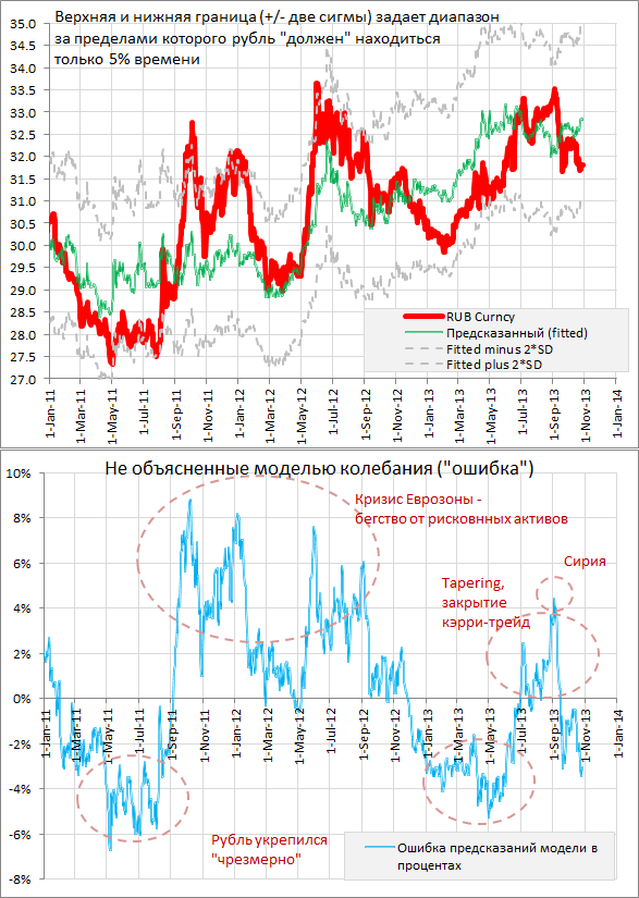 Рубль дороговат. В последние пару недель рубль имел тенденцию к укреплению, тогда как нефть снижалась. При текущей стоимости «Брента» в $107/баррель наша модель предсказывает курс 32.8 руб./$ что почти на рубль отличается от текущего курса 31.8 руб./$. Разбег модельного и реального курса в 3% нельзя назвать экстраординарным, он может сохраняться таковым несколько месяцев, если судить по предыдущим подобным эпизодам (весны-лета 2011 г. и весны-лета 2013 г.). Но мы ожидаем некоторого ослабления курса.