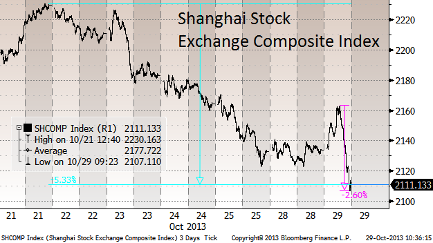 Китайские акции сегодня упали до минимума за последние 7 недель. В начале дня был рост индекса Шанхайской биржи (до +1.4%) на сообщении, что Банк Китая добавил ликвидности в систему, запустив операции 7-дневного РЕПО. Но затем рынок резко ушел в минус, так что снижение с дневного пика составило 2.6% (см. график). Как пишет Bloomberg, это произошло потому, что Банк Китая «не смог снизить ставки денежного рынка».