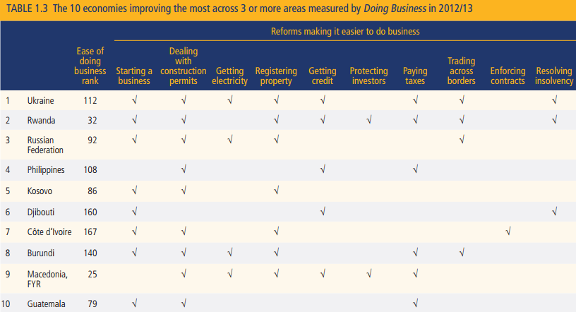 Россия показала в нем заметное улучшение, поднявшись до 92 места, что позволило занять 3-е место. Это хороший прогресс со 155 места в 2004 году. России удалось улучшить положение за счет улучшения процедур подключения к сетям, снижения бремени разрешений (см. таблицу). Однако без заметных улучшений остались вопросы налогов, защиты прав акционеров, выполнения контрактов, процедур банкротства.