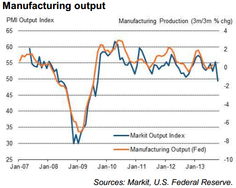 В пятницу Markit опубликовал «flash»-индикатор «Manufacturing Purchasing Managers Index» (PMI) по США, оперативную оценку уверенности октября, собранную по не всем собираемым за месяц анкетам (примерно 85% от общего числа). Зарегистрировано резкое ухудшение настроений в октябре, что должно быть реакцией на «шатдаун».