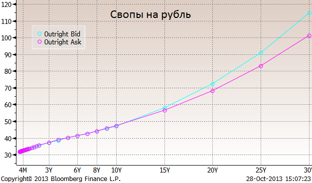 Вот пример того, как выглядит форвардная кривая свопов на рубль (валютные свопы и валютные форварды это одно и то же, это обязательство купить или продать валюту по фиксированному курсу).