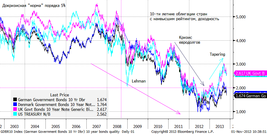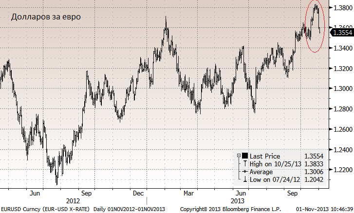 Вчера в Штатах вышла статистика, говорящая о неплохом состоянии экономики. Первоначальные заявления по безработице снижаются. Удивил индекс региональной уверенности на территории Чикаго, резко взлетевший в октябре (несмотря на бюджетное противостояние) и поднявшийся до рекордных значений. Этот индекс предваряет выход национальных индексов PMI в ближайшие часы и дни. Если выходящая экономическая статистика будет подтверждать отличное состояние экономики США, начала «tapering»-а QE в декабре-январе не избежать. В таком случае окончание «печатания» придется на середину следующего года.
