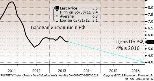 Итак, в ДКП Центробанк ставит «точечные» цели по инфляции (вместо диапазона, как было ранее): 5,0% в 2014 году, 4,5% в 2015 году и 4,0% в 2016 году. Консенсус-оценки инфляции примерно на 0.5% выше (хотя есть несоответствие цифр, Bloomberg оперирует среднегодовыми показателями, ЦБ РФ — на конец года).