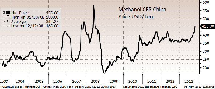 «Метафракс» отчитался за 9 месяцев 2013 г. Выручка выросла на 21% к аналогичному периоду 2012 г., до 9,87 млрд. руб. Чистая прибыль выросла на 49%, до 2,48 млрд. руб. Производство основных продуктов осталось на уровне прошлого года. Улучшение финансовых показателей обусловлено ростом цен на метанол (см. график) и его производные, а также снижением затрат.
