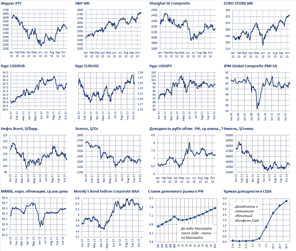 Изменения малы: ММВБ минус 0.6%, S&P 500 минус 0.3%, STOXX Europe 600 минус 0.2%. Из лент новостей можно понять, что основной обсуждаемый вопрос- как будет изменять монетарную политику ФРС (когда начнется «тейперинг») и ЕЦБ (будет ли снижать ставки из-за упавшей инфляции). А пока состояние рынков акций можно назвать паузой.