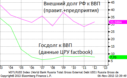В качестве факторов риска принято указывать, что у России большой внешний (инвалютный) долг. Если в начале 2000-х было должно правительство РФ, то сейчас назанимали предприятия и банки. Но ситуация не так однозначна, если посмотреть на цифры. Сейчас внешний долг составляет $720 млрд. (правительство и Центробанк $80 млрд. + банки $213 млрд. + «прочие секторы» $427 млрд.). Кажется, много. Но если посчитать соотношение «внешний долг» к ВВП, окажется, что оно остается стабильным или, даже, падает. Так, по итогам 2012 года долг был $600 млрд., а $ВВП — 2 трлн., что составляет около 31%. На графике ниже мы также показываем соотношение госдолга к ВВП.