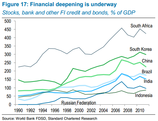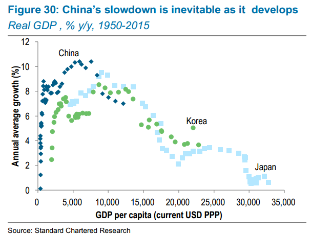 Быстрый рост Китая является нормальным для бедной страны, испытывающей догоняющее развитие. После того, как проходит фаза «индустриализации», рост замедляется. Показательный график из аналитики «Стандарт чартеред» дает понять как может развиваться Китай. Наблюдаемое сейчас замедление страны — это нормально, ожидаемо. Также это говорит о том, что «сырьевой суперцикл», похоже прошел свой пик. Китай уже не будет обеспечивать настолько мощный прирост спроса на сырьевые товары, как это было в «нулевых».