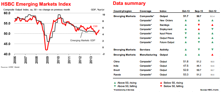 Развивающие рынки наметили тенденцию к росту. HSBC ввели расчет нового опережающего индикатора Emerging Markets Index для мониторинга экономического развития 17 развивающихся стран. Полученные оценки опережающего индикатора дезавуируют ранее опубликованные прогнозы ведущих аналитических агентств о том, что развивающиеся рынки исчерпали свой потенциал и в приоритете сейчас становятся развитые рынки. В октябре Emerging Markets Index продолжает уверенно расти, достигнув отметки в 51,7 п., что является максимумом за последние 7 месяцев. Улучшение наблюдается как в секторе услуг, так и промышленности. Бразилия, Россия и Китай главным образом поддерживают рост развивающихся рынков.