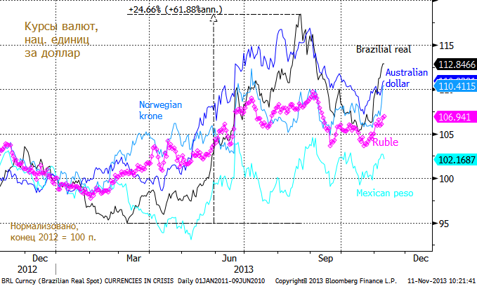 Рубль продолжает снижаться к доллару, 32.7 руб./$. Причина роста доллара, как это уже было весной-летом 2013 г., вновь связана с ожиданиями предстоящего ужесточения денежной политики в США. Обратите внимание, что движение рубля не выглядит настолько масштабным, как колебания других валют.