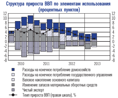 График с данными по росту ВВП по «элементам использования» показывает, что торможение в заметной степени определяется минусом по валовому накоплению оборотного капитала. С нашей точки зрения это симптом дорогих денег. Бизнес вынужден уменьшать остатки ликвидных (легко продаваемых) активов, чтобы высвободить капитал и не платить по нему высокие проценты. Обратите внимание, что в 2010-2011 гг. эта же статья давала заметный прирост, но это было время крайне низких процентных ставок, а ужесточение денежной политики в стране случилось только с конца 2011 г.