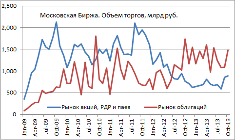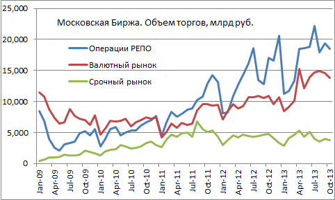 «Московская биржа» опубликовала статистику торгов за октябрь (см. файл excel). Вот несколько графиков на базе этих данных.