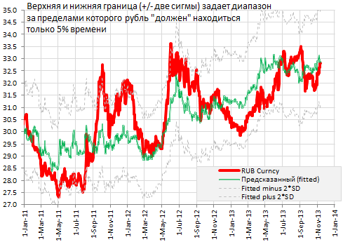 Рубль снижается, несмотря на проводимые ЦБ РФ интервенции. Это нормальное движение, если учесть то, что доллар растет к валютам развивающихся и не только стран (см. вчерашний обзор). При текущей цене Брента в $106/баррель модель предсказывает курс 32.87 руб./$, тогда как наблюдаемый курс практически равен этому значению на $31.84 руб./$.