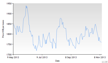 «Русал» вчера отчитался по МСФО за 9 месяцев 2013 г. — результаты слабые, но лучше прогнозов. За 3 квартала выручка составила $7,63 млрд., снизившись на 7,6% (консенсус-прогноз $7,57 млрд.), EBITDA составила $550 млн. (минус 20,7%, прогноз был $545,3 млн.). Чистый убыток вырос до $611 млн. против $117 млн. в прошлом году. Компания при этом снижает долг — за 9 месяцев он упал на 6,4%, до $10,6 млрд. Соотношение Долг/EBITDA в годовом выражении составляет 14,5, огромный показатель. На показатели компании крайне негативно влияют низкие цены на алюминий в мире. «Русал» проводит программу повышения эффективности деятельности — в результате приостановки работы ряда заводов удалось снизить себестоимость производства алюминия в III квартале на 2%, до $1872 за т. — всё равно ниже текущих цен, не считая премии (см. график цен на алюминий за последние 6 месяцев ниже). Тем не менее, надежда у компании есть — пока что её поддерживают дивиденды «Норникеля», а на ближайшие год-два в мире запланировано масштабное сокращение производства алюминия, что должно повысить цены.