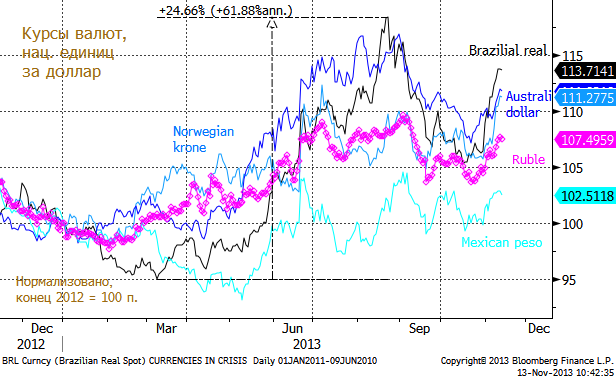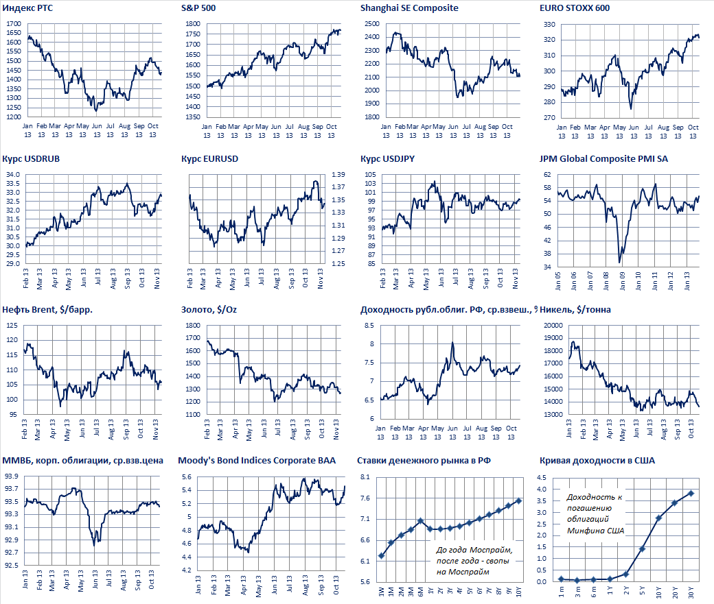 Индекс ММВБ +1.14%, STOXX Europe 600 минус 0.6%, S&P 500 минус 0.2%. Вчерашний плюс российского фондового рынка выглядит странным, при общей понижательной тенденции на других фондовых рынках. Сохраняется давление из-за «QE tapering», в частности падают валюты к доллару (включая рубль), растут процентные ставки (длинные ОФЗ приближаются к 8% годовых, «десятки» США близки к 2.8%, рекорд с сентября).
