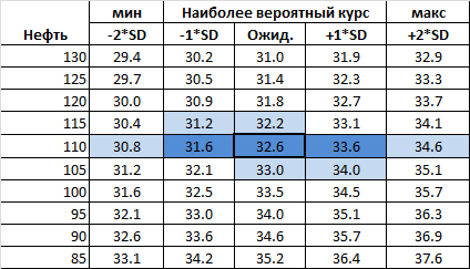 Обновленная таблица сценарных прогнозов текущего курса в зависимости от колебаний нефти сейчас выглядит так ($110 — условная середина колебаний нефти, поскольку средняя цена Брента в 2013 — $108.5/баррель).