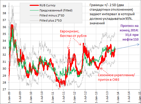 С учетом инфляции рубля, создающей «снос» курса, наш текущий прогноз — 33.6 руб./$ на конец 2014 г., при цене на нефть в $110/баррель. Если цена на нефть будет ниже, скажем $100/баррель, тогда курс конца 2014 г. должен быть 34.6 руб./$.
