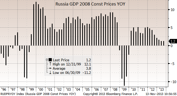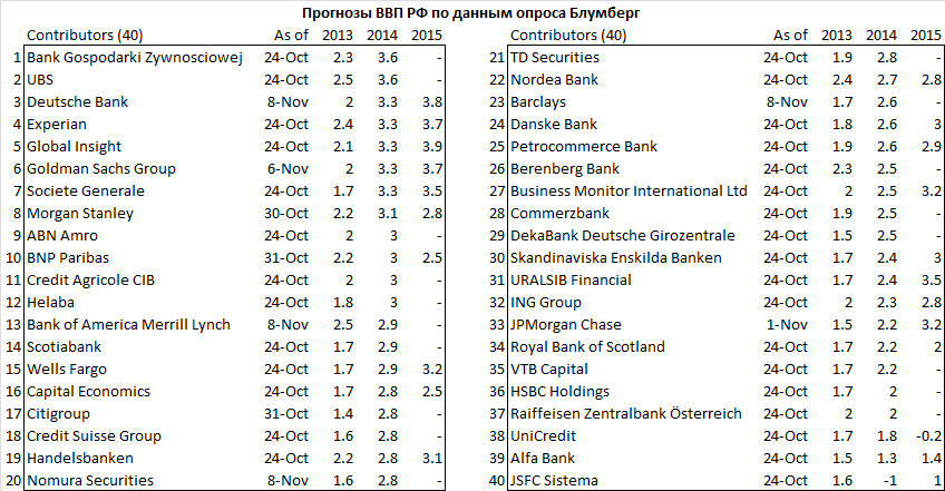 Публикация данных Росстата о росте ВВП в 3-м квартале не является сюрпризом. Между тем, есть много экспертов, которые считают что в следующем, 2014 году, Россия будет расти заметно быстрее. В таблице ниже мы отсортировали текущие прогнозы аналитиков инвестбанков на 2014 год по степени оптимизма. Из 40 оценок только три ниже 2%.