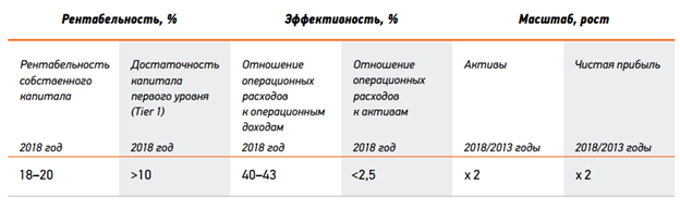ROE должно остаться примерно на текущем уровне в 18-20%, эффективность должна повыситься — отношение операционных расходов к активам должно опуститься до уровня в 2,5% с нынешних 3,1%. Достигнуть этого планируется за счёт увеличения количества транзакций, совершаемых через дистанционные сервисы. Г.Греф при этом заявил, что количество сотрудников может быть уменьшено примерно на 12% к 2018 г., до 220 тыс. чел., а количество офисов на 10-20% при нынешних 18 тыс. Также «Сбербанк» планирует наращивать активы за рубежом, что и позволит наращивать активы, не будучи ограниченным домашним рынком. Будет расти доля маржинальных продуктов для физлиц — POS и автокредитов, кредитных карт, до 22% с нынешних 13%. Повысить планируется и количество продуктов на одного клиента. В стратегии также отмечается, что серьёзную долю в сегменте осуществления платежей займут небанковские организации за счёт предложения новых моделей обслуживания для клиентов и более низкой регуляторной нагрузки. Шаг в этом направлении «Сбербанк» уже сделал — летом 2013 г. была закрыта сделка по покупке 75% минус одна акция «Яндекс.денег».