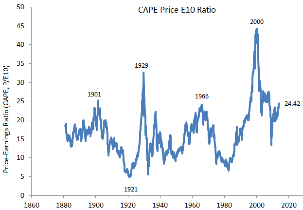 Другой график — показывает оцененность американского рынка по мультипликатору P/E, где под прибылью Е подразумевается среднее значение реальной прибыли за последние 10 лет, что позволяет избавиться от изменчивости этого показателя из-за влияния бизнес-цикла. Это так называемое CAPE (Cyclically adjusted price-to-earnings ratio), данные для которого обновляются Р.Шиллером на сайте irrationalexuberance.com