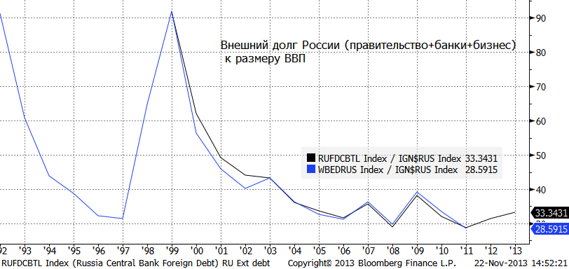 Но внешний долг РФ не является принципиальным. Вот график соотношения внешнего (валютного) долга к ВВП, выраженный в процентах. К примеру, сейчас внешний долг оценивается в сумму порядка 700 млрд. долларов (бизнес+правительство), при ВВП равном порядка 2.1 трлн., что дает соотношение примерно в 33%. Эта цифра является близкой к минимуму по историческим меркам.