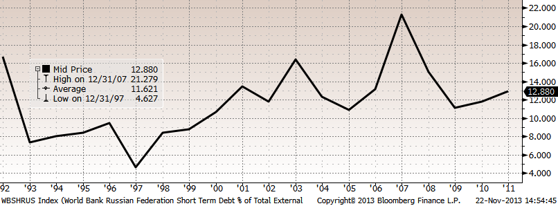 Вот еще один график, соотношение краткосрочного (до года) долга к ВВП по данным Всемирного банка. Цифра является незначительной и она меньше, чем была в 2008 году.