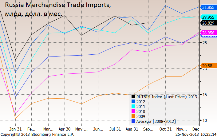 Ниже представлены сезонные траектории товарного импорта в РФ. Отчетливо видно падение импорта в январе и заметный рост его в конце года. Мы полагаем, что это связано с «высоким сезоном» под новогодние праздники.