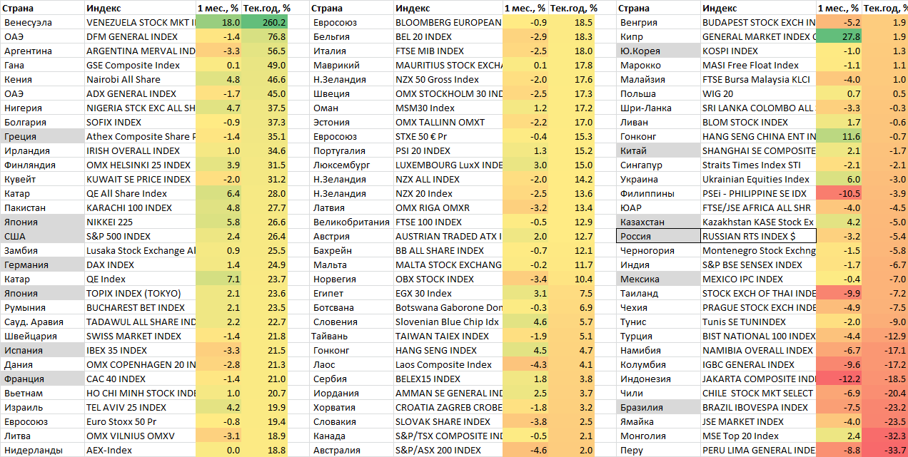 Мы подготовили статистику по национальным фондовым рынкам, отсортировано по темпам роста с начала, все изменения — в долларах. Среди крупных рынков в лидерах Япония и США. Развивающиеся рынки в этом году не в моде.