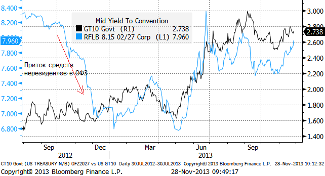 На этот раз снижение ОФЗ происходит без активного движения длинных госбумаг США, и является специфической тенденцией. Очень вероятно, что падение ОФЗ и давление на акции развивающихся стран отражает «выход» иностранного капитала с развивающихся рынков. Причина этому мало понятна.