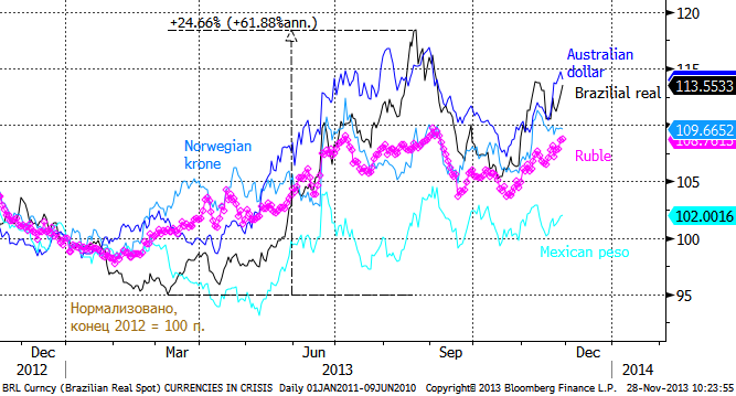 Колебания, которые мы видим в осенние месяцы являются отголосками этих событий. В сентябре вышли слабые данные, ФРС не пошла на сокращение QE, что привело к укреплению валют с высокими ставками, сейчас, мы думаем, пошло обратное движение.