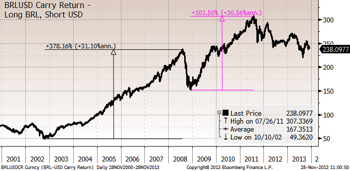 Мы полагаем, что это движение вновь отражает развал стратегий «кэрри-трейда». График ниже показывает, как работает эта стратегия с бразильским реалом. Это экстремальный вид валюты, но зато очень показательный. Бразилия имеет огромные внутренние ставки (из-за низкой нормы сбережений внутри страны), так что стратегия работает очень хорошо.