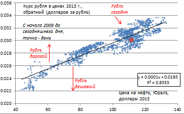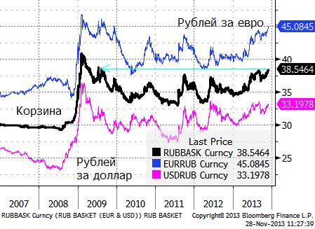 Сейчас рубль отклонился примерно на 2% от своего исторического значения и мы полагаем, что его нужно покупать. Мы не верим в прогнозы курса 36 или 37 руб./$. Даже если допустить провал до такого значения, он не сможет быть устойчивым и курс неизбежно вернется обратно. Наши ожидания — в начале 2014 г. курс будет ближе к 32 руб./$.