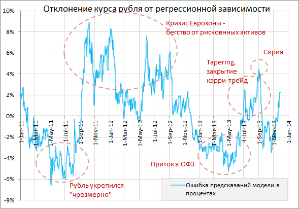 Вот график, сравнивающий реальный рубль с реальной нефтью. Рубль сейчас слегка дешев, но не катастрофически дешев. На этом основании его нужно покупать. Из этой модели можно вывести «ошибку» предсказаний, объясняемую иными факторами.