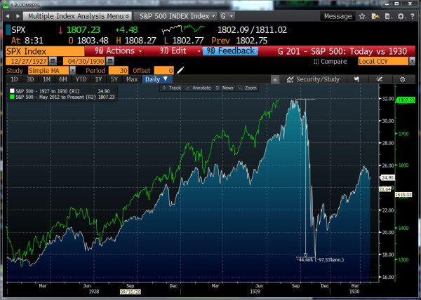 Вот еще один график , который, был популярным среди пользователей Блумберг. Сравнивает траекторию акций США с тем, что было перед Великой Депрессией.