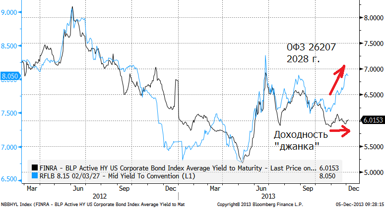 Мы заметили еще одно расхождение развивающихся рынков и американского рынка долга. График выше сравнивает доходность длинной российской ОФЗ, и усредненную доходность американских облигаций с низким рейтингом (ниже ВВВ, т.е. «джанка» от junk, что означает «мусорные облигации»). Если в прошлые годы движения были синхронными, связанными с позицией ФРС, то за последние месяцы наметилось расхождение. Возможно, это отражает специфику РФ.