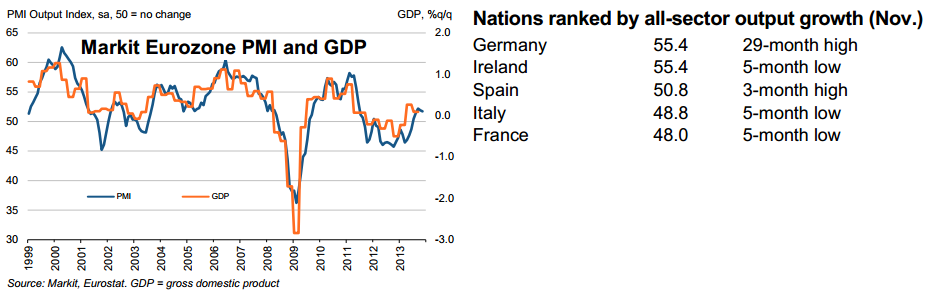 Вот еще одна оценка дел в Еврозоне от MarkitEconomics. Состояние дел неоднозначное. Рост в Германии на максимумах за 29 меясцев, а по другим странам произошло ухудшение. На основании этих данных Markit оценивает рост ВВП Еврозоны в 4-м квартале всего на 0.2% по сравнению с ростом в 0.1% в 3-м квартале.