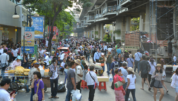 Ближе к деловому центру, на улице Сукумвит и Сиамской площади, Бангкок становится совершенно иным — шумным и многолюдным. Здесь самое плотное скопление митингующих. Толпа огромна! Вся она сине-бело-красная (забавно, но тайский флаг раскрашен так же, как российский, разница в количестве полосок: у тайцев две красные, две белые и одна синяя в центре): митингующие носят цветные браслеты, повязки, бантики, значки, наклейки на щеках... Главные признаки революционера — свисток, подвешенный на шнурке патриотичной расцветки, и, конечно же, национальный флаг — их множество над толпой.
