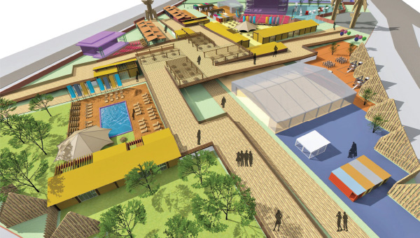 В городке нашлось место бассейну с пляжем, спортивному городку и пяти детским площадкам, в том числе Картонии, которая в этом году будет огромной и интерактивной.