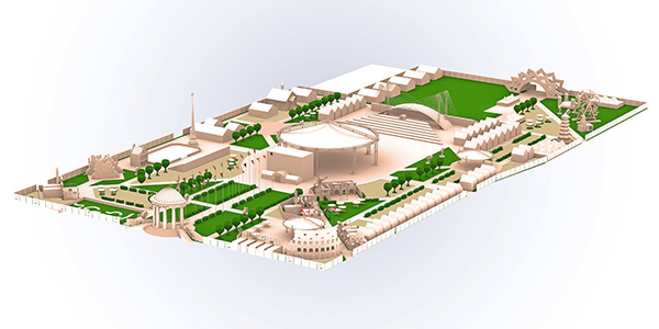 Если проект «ИнтерСферы» действительно будет реализован, в июне на эспланаде появится Пизанская башня, Колизей, Биг Бен, шпиль Адмиралтейства, голландская и русская деревни, китайская пагода, мельница Дон Кихота, Эйфелева башня, под которой протянется Аллея поцелуев, а в центре — огромный шатёр, который, по задумке Вадима Некипелова сотоварищи, сделает фестиваль всепогодным. Вход с улицы Попова будет оформлен в виде ротонды — символа Перми.
