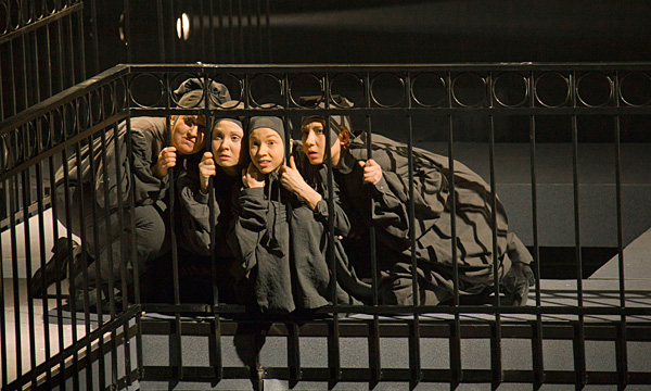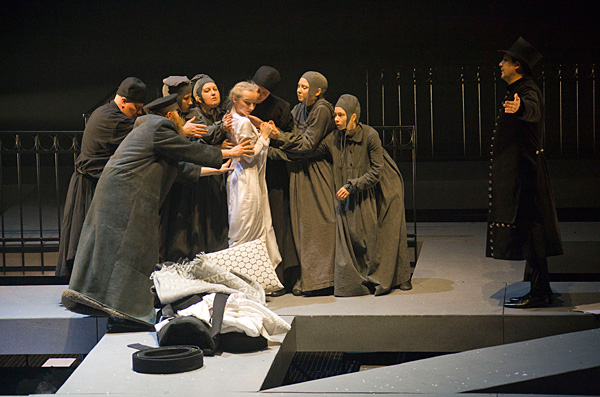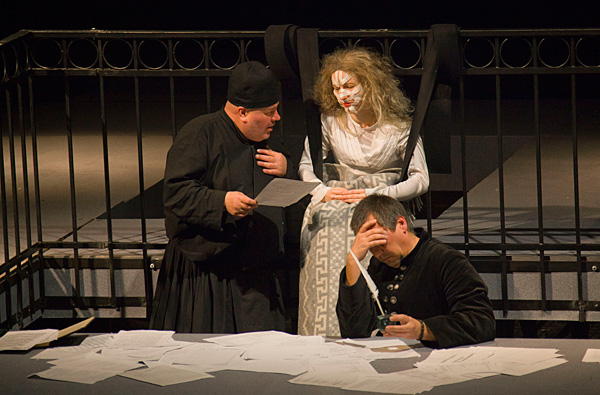 Минималистичный, по линейкам расчерченный мир спектакля самой своей фактурой протестует против идеи безумия. Разумеется, нет здесь никакого побега сквозь вьюгу от грозного Медного всадника, но это не так важно: главным проводником безумия, порождённого алчностью, помноженной на безденежье, должен быть Германн, а он таковым в спектакле не является. Сергей Детков играет уравновешенного, расчётливого инженера, и после рокового проигрыша ничто в нём не меняется. Лишь сплетники доносят до нас новость о том, что Германн попал в сумасшедший дом.