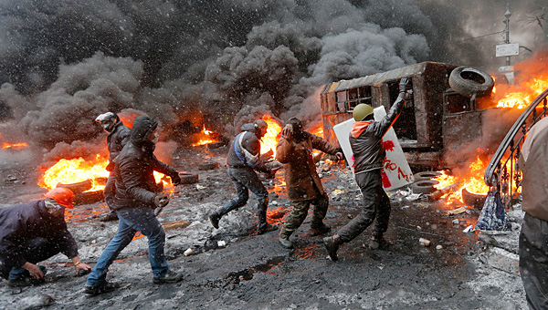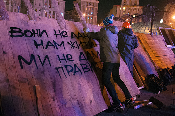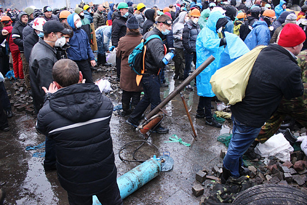 20 февраля. Вчера рядом с моей работой активисты (правый сектор, среди них был и муж моей однокурсницы, художник) пытались заблокировать выезд курсантов МВД на Киев. Их побили гопники Гепы (Геннадий Кернес — ред.). Я пыталась заснять видео, как они пошли колонной в масках, с битами и щитами в зелёных жилетах. Народ тут же врассыпную. Мне парень рядом говорит: «Женщина, бегите, они бьют всех подряд, особенно женщин, они ж не могут увернуться или сдачи дать».