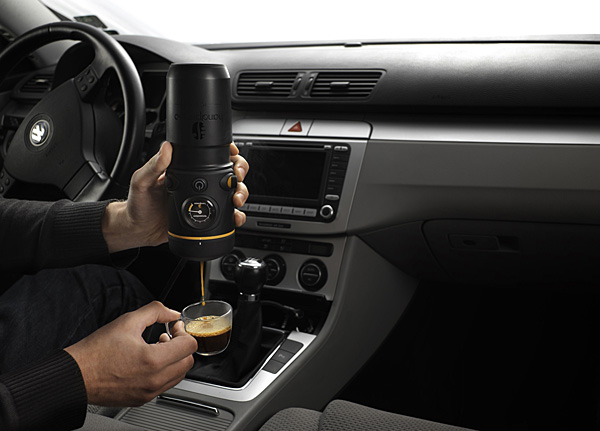 Для тех, кто в дороге не может без живительной тёмно-коричневой эмульсии, придумана автокофеварка. Гаджет зовётся Handpresso Auto. Работает он от прикуривателя. Автомобильная кофе-машина проста и удобна в эксплуатации, помещается в подстаканнике любого авто и готовит эспрессо в течение пары минут.