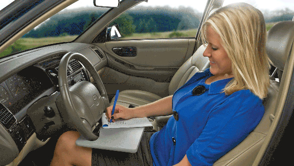 Ну вот, всё есть — горячее и холодное питьё, неостывающие пирожки, замороженное сальце. Есть хочется неимоверно, но ехать надо дальше. Что делаем? Останавливаемся, ставим стол… Стоп, какой стол — это же потеря времени? Не всегда. Мы ставим стол на руль. Называется такое устройство «столик автомобильный универсальный» и решает проблему комфортного поглощения пищи в автомобиле в пять секунд.