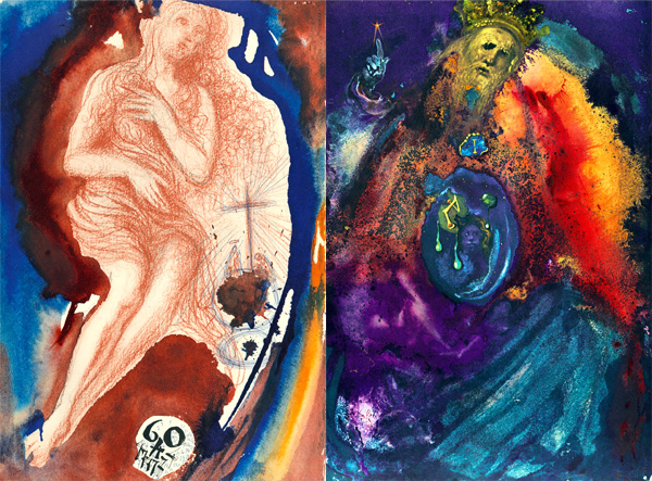 Иное дело — графика, представленная в Центральном выставочном зале. Она менее чувственная, более философская и в то же время очень экспрессивная по цвету, линии, пластике. Здесь почти нет привычных сюрреалистических образов (растёкшегося времени, экзистенциальных подпорок), за исключением любимых Дали длинноногих слонов, появляющихся всего в одном из 105 листов. Зато очень много абстрактного, что логично вытекает из иллюстрируемого текста: Дали отважно взялся не только за знакомые всем, легко воспринимаемые книгу Бытия и Евангелие, но и за многозначительное Откровение, а также за книги пророков, которые вообще невозможно воспринимать буквально, поскольку они состоят из сплошных притч и иносказаний.