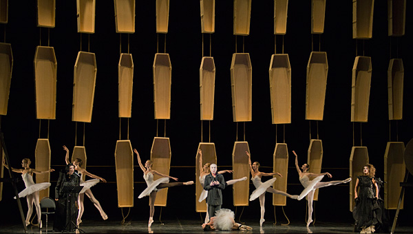 Смерть здесь, несомненно, эстетизируется в самом разнузданно декадентском ключе (чего стоят только восхитительные похоронные венки, установленные по обе стороны сцены!), но поскольку речь идёт всё-таки о произведении XXI, а не ХХ века, модернистский пафос снижается постмодернистской иронией. Яламас и Курляндский вложили в своё творение немало своеобразного юмора.