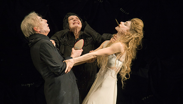 Народная артистка России Алла Демидова, произносящая текст Корифея (то есть рассказчика), тем, наверное, пришлась по душе постановщику Теодоросу Терзопулосу, что приняла и освоила эту актёрскую функцию и эти художественные принципы, совершенно очевидно и даже декларативно проистекающие из эстетики античного театра, где роли именно что произносились, а не игрались. Демидова умудряется вложить душу, страсть, пафос не в исполнение роли, а в механическое произнесение загадочных, но в то же время ярких в своей образности текстов.